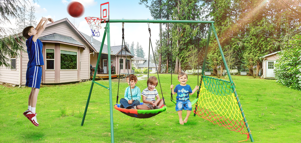 Kids 5-in-1 Outdoor Swing Set – Saucer Swing, Belt Swing, Basketball Hoop & Soccer Goal