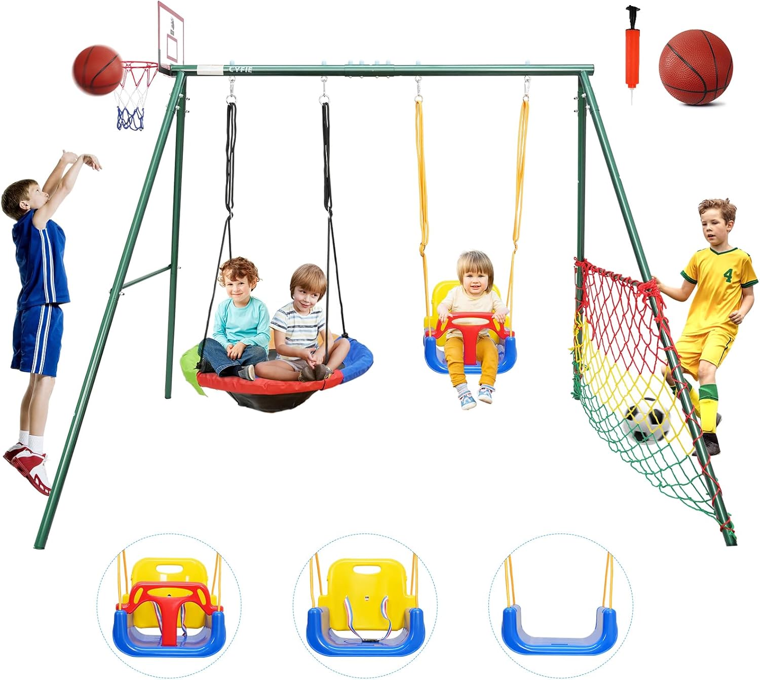 Kids 5-in-1 Outdoor Swing Set – Saucer Swing, Belt Swing, Basketball Hoop & Soccer Goal