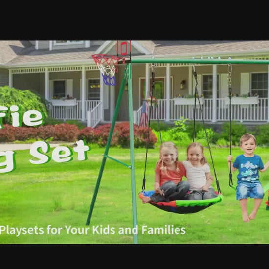 - [Multi-functional Swing Set]: The swing set includes 1 Saucer Swing Seat and 1 Belt Swing Seat, 1 Basketball Hoop with Basketball Goal Backboard, 1 Basketball and 1 Ball Pump with Needle, 1 soccer goal, combining different outdoor activities, and providing perfect backyard playsets for your kids.