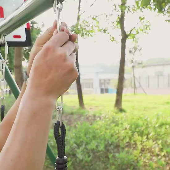 - [Practical Design]: With extra carabiners, you can easily attach any other types of swings you want to our swing set, like porch swings, net swings, web swings, hanging chairs, baby carrier swings, yoga swings and more. With a max 440 LBS weight bearing capacity, even adults can have some fun on it.